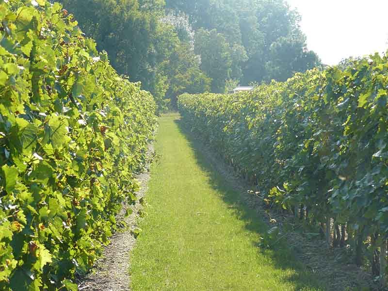 Pour ce qui est de l'entretien, une fois l'an seulement, un désherbage chimique est réalisé sur le "cavaillon" (sous le rang). En période estivale, celui-ci est entretenu de manière mécanique (lames et dents pour arracher l'herbe).